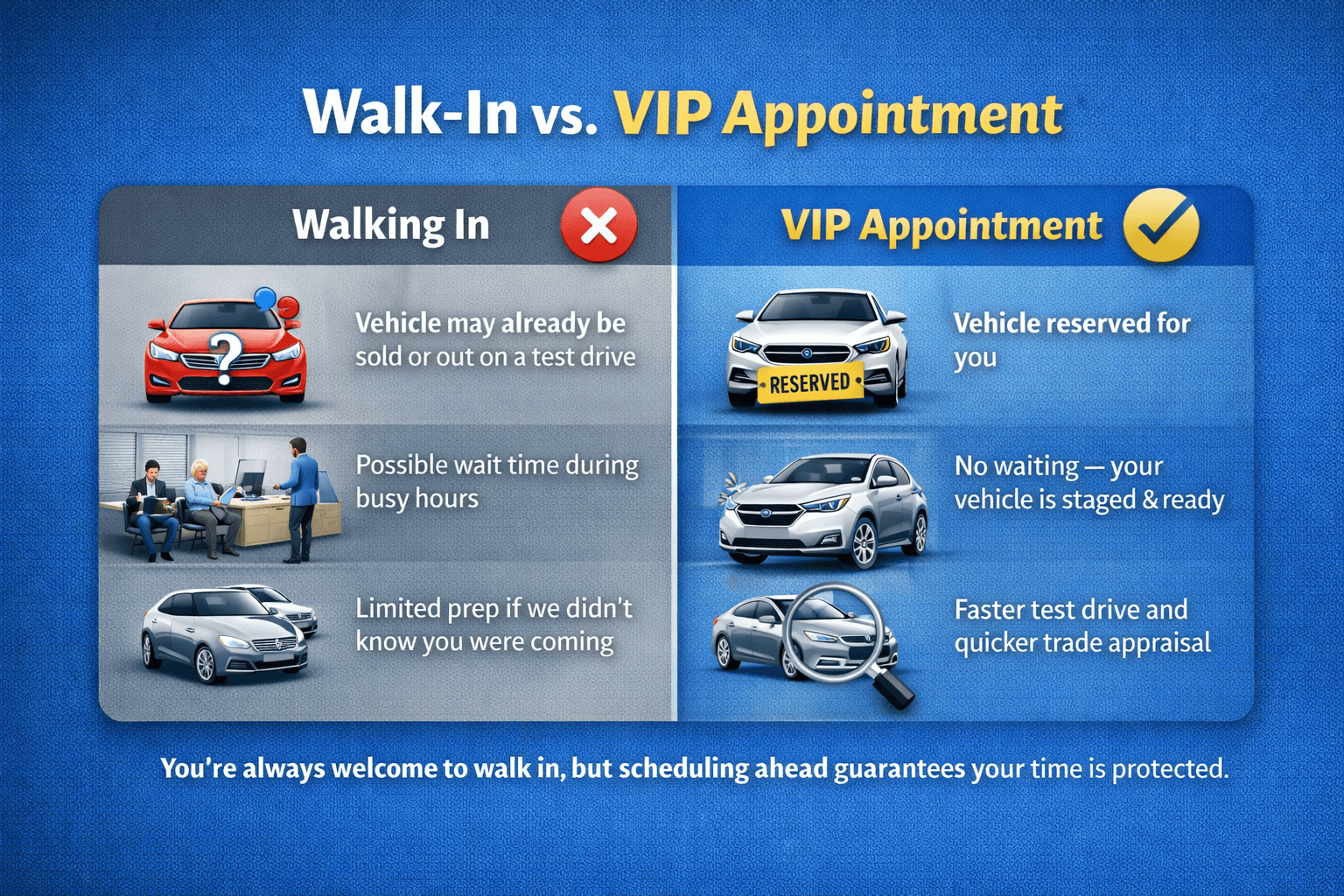 That’s okay. A VIP Appointment is about saving time, not pressure to buy. We’ll help you explore other options if needed.